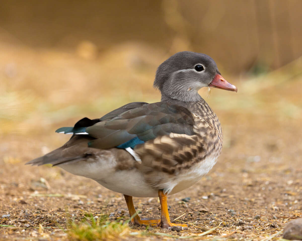 Mandarin ducks exhibit sexual dimorphism, and females are much less conspicuous than males. Females have mottled brown and white plumage across most of their bodies, as well as a distinctive thin white ring around their eye that continues back to a thin, horizontal white stripe across their cheek.